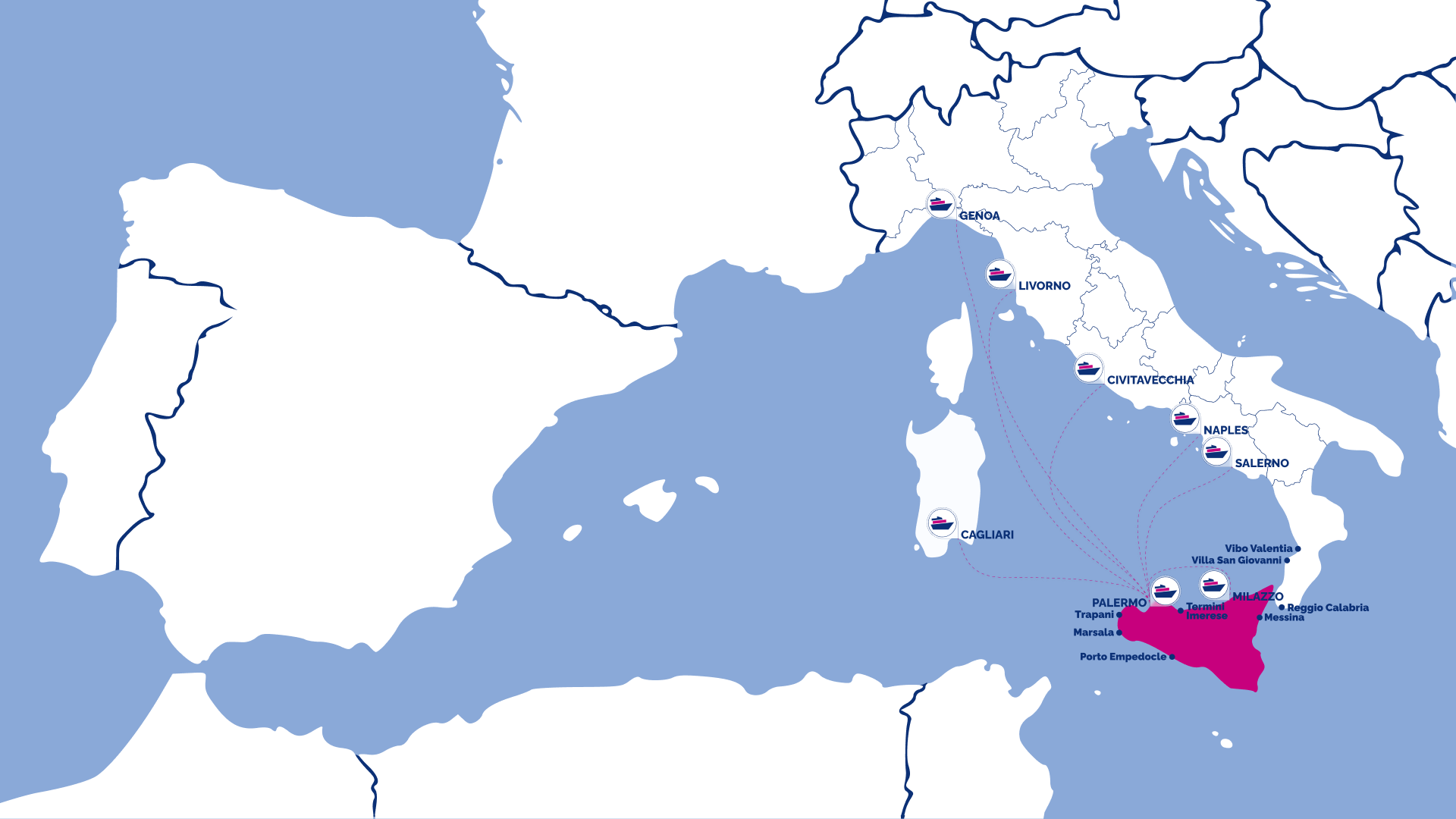 Der Hafen von Palermo ist gut mit den Städten und Inseln Siziliens verbunden, somit kann eine hohe Anzahl von Überfahrten, das ganze Jahr über garantiert werden, mit Zielhäfen wie Civitavecchia, Cagliari, Livorno, Napoli, Genova und Salerno.